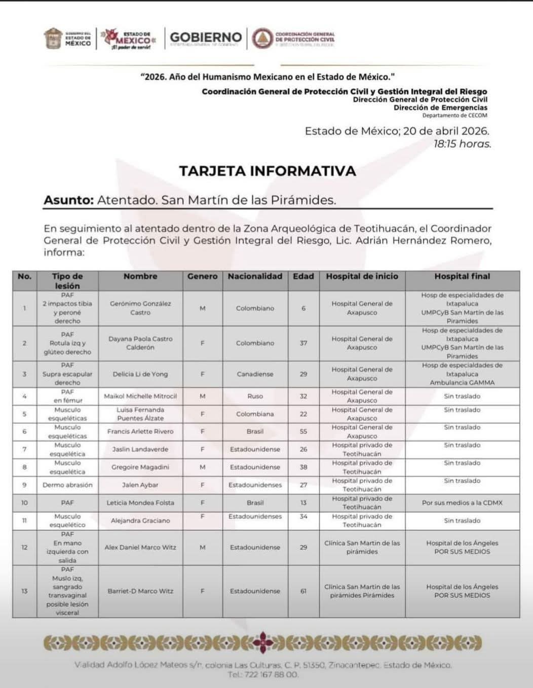 6 de 13 heridos en Teotihuacán, ya Fueron dados de alta; Castañeda