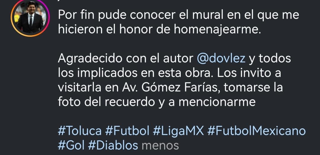 Además, Pepe Cardozo dejó la invitación a la afición a visitar el mural ubicado en Gómez Farías, en Toluca, tomarse la foto del recuerdo y etiquetarlo.