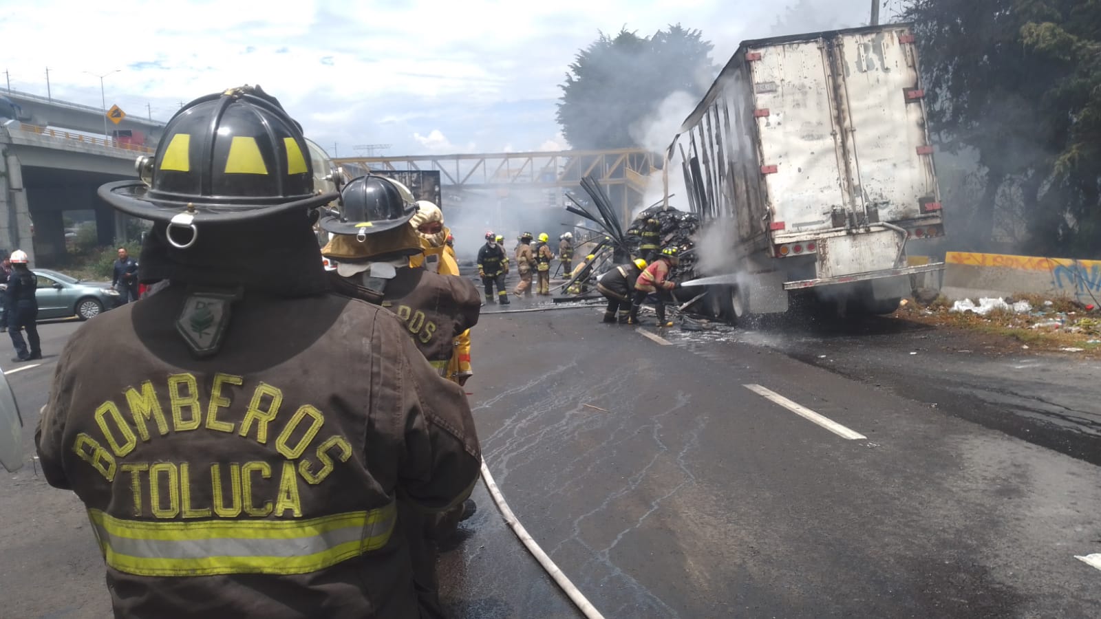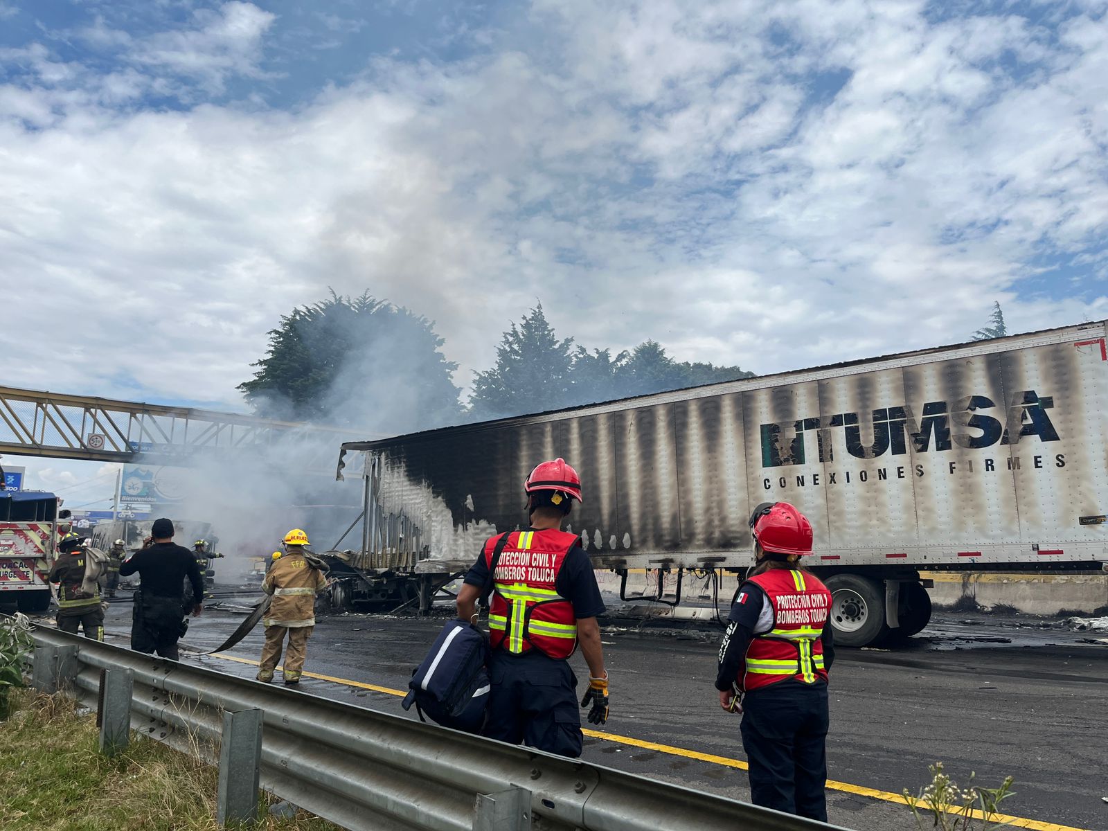 Elementos de la Coordinación de Protección Civil y Bomberos de Toluca respondieron al incendio provocado por la colisión entre tres tractocamiones en la carretera libre México-Toluca, a la altura de Río Hondito, con dirección a Toluca.