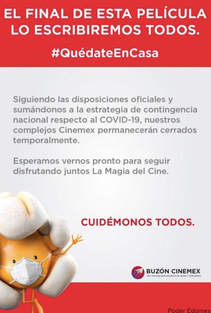 En el caso de Cinemex, si bien no ha informado las medidas que tomará para apoyar a su personal durante la suspensión de actividades, informó que donará sus alimentos perecederos a los 55 Bancos de Alimentos en México. Quienes hayan adquirido boletos para funciones en sus salas, pueden comunicarse vía correo electrónico buzon@cinemex.net.