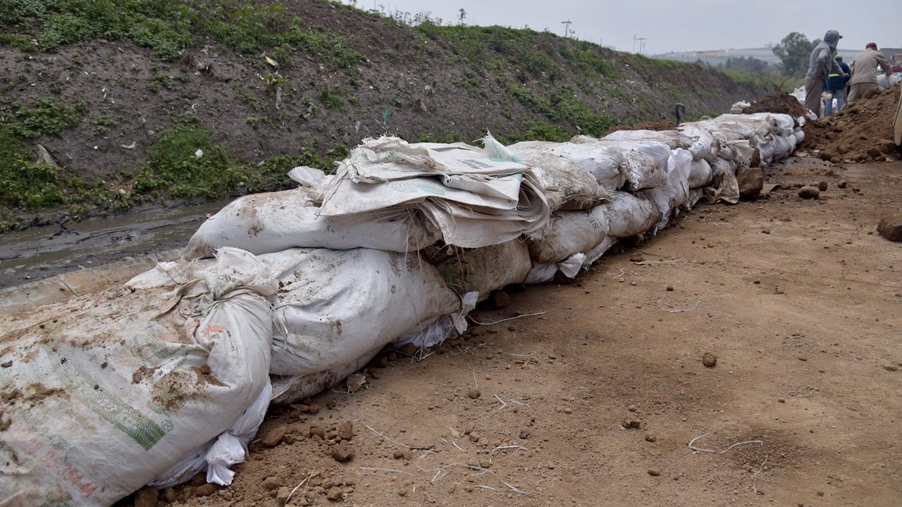La cuadrilla de 20 trabajadores de la CAEM apoya con el acarreo de material, llenado de costales y colocación de los mismos en el bordo, donde hasta el momento se han dispuesto 5 mil sacos de piedra y tepetate, en una longitud de 80 metros, aproximadamente.