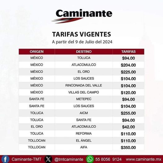 A partir de este martes 9 de julio del 2023, las tarifas de la empresa camionera Caminante sufrirán un incremento de 10 pesos, en promedio, en todos sus destinos y horarios, anunció la propia compañía que cubre rutas en el Valle de Toluca hacia la capital del país y algunas localidades de la zona norte de la entidad.