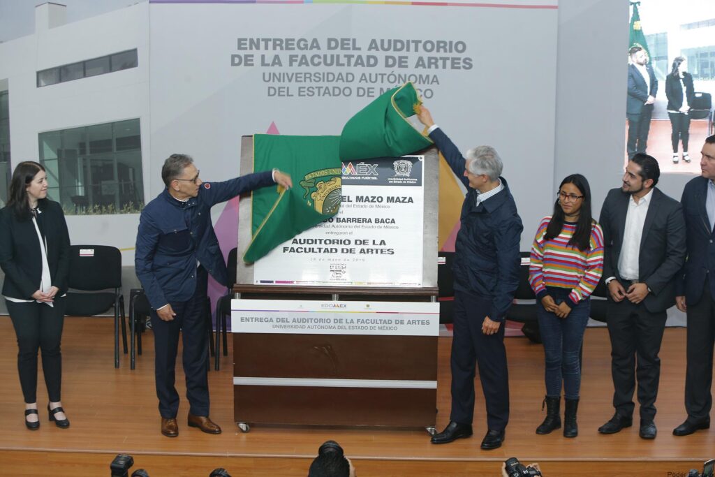 Al inaugurar el auditorio de la Facultad de Artes de la Universidad Autónoma del Estadio de México, el jefe del ejecutivo mexiquense, Alfredo Del Mazo Maza, reconoció el esfuerzo de esta casa de estudios para trabajar a favor de la inclusión educativa y ampliar su matrícula para que durante el siguiente ciclo escolar mil 500 jóvenes puedan continuar con sus estudios de nivel medio y superior. En la Facultad de Artes, acompañado del rector Alfredo Barrera Baca, entregó a la comunidad universitaria infraestructura, equipamiento y mobiliario por un monto de 60 millones de pesos y destacó que para refrendar el liderazgo académico y social de la UAEM, autoridades universitarias y de la entidad unen esfuerzos.