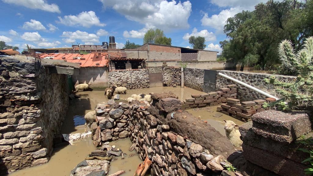 En un tramo ya se desbordó el río e inundó la carretera de acceso y dos casas de la familia Valencia, en la que habitan 10 familias, que llevan dos días con agua en el interior con unos 40 centímetros, además que el corral con borregos y gallinas sigue entre agua.