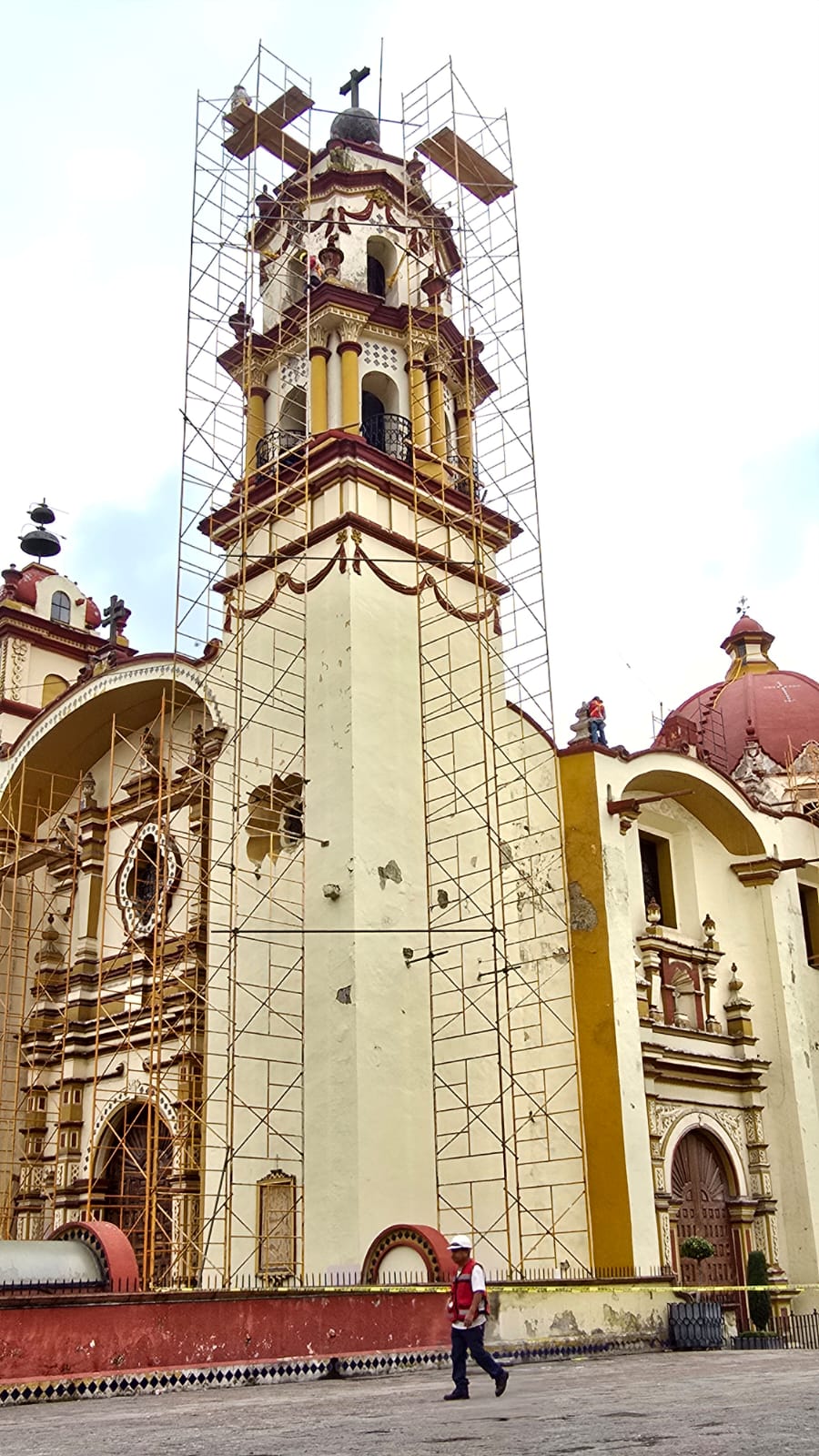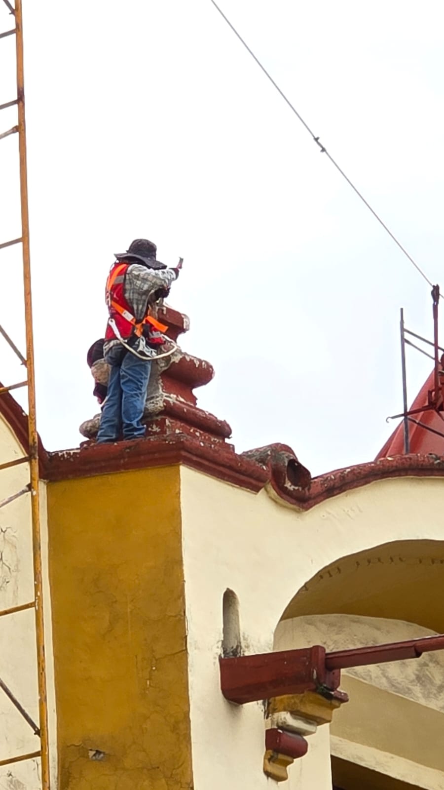 El templo de la Santa Veracruz, que comenzó a construirse en 1753, en un espacio en el que los franciscanos habían edificado una capilla durante el siglo XVI, está siendo remodelado en su estructura exterior, por una cuadrilla de trabajadores.