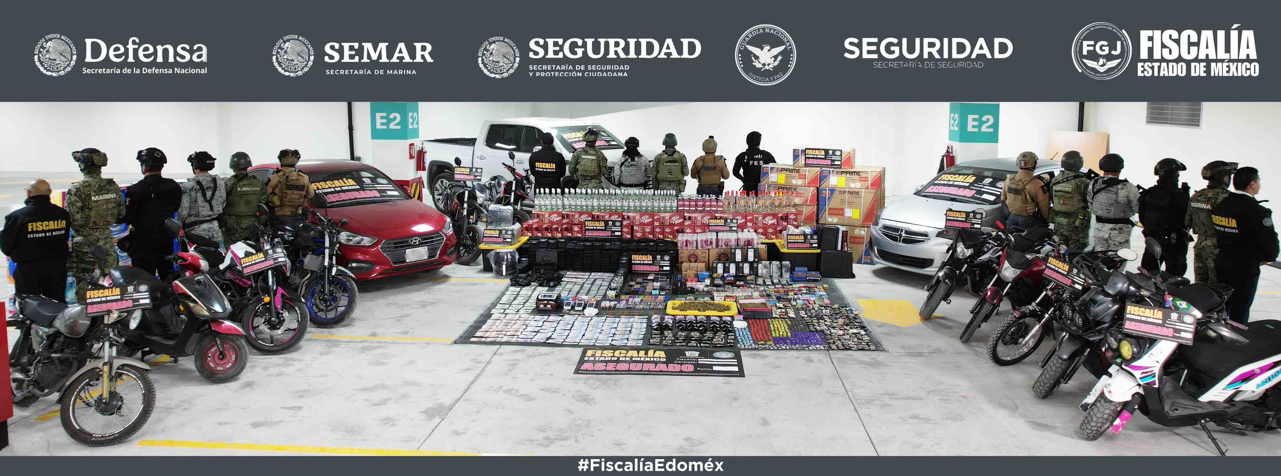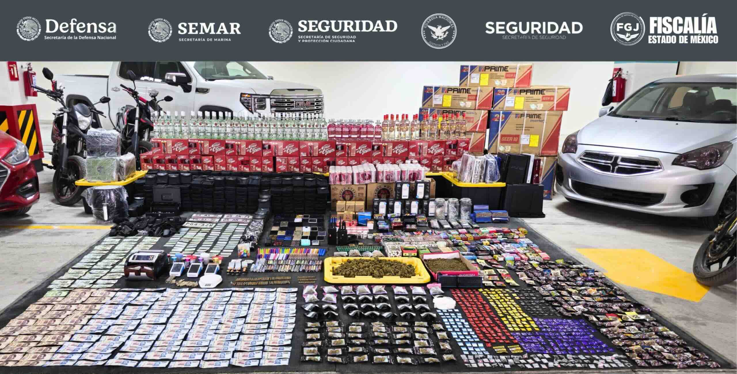 Asimismo, se aseguraron 15 vehículos, 2 inhibidores de señal, 334 cartuchos útiles de diversos calibres, 50 botellas de bebidas alcohólicas, 24 consolas de videojuego, 166 binoculares, 110 vapeadores, 47 teléfonos celulares, 5 placas vehiculares, 78 tarjetas de circulación, una caja fuerte, un contador de billetes, terminales de pago nuevas y semi nuevas, numerario, 3 troqueles y una gorra policial, además de diversa mercancía consistente en equipos de aire acondicionado, calentadores climáticos, electrodomésticos y productos de papelería y laboratorio, de los que se investiga su procedencia.