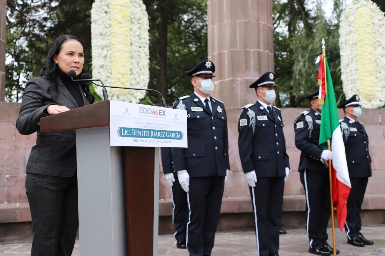 En el Hemiciclo a Juárez, en la ciudad de Toluca, Alejandra Del Moral destacó que los mexiquenses conmemoran a Benito Juárez con unidad, paz, siendo leales a México y a sus instituciones, unidos bajo los principios de liberalismo social y político, estado laico y democrático, República federal, sociedad secular con libertad de conciencia, de expresión y de asociación.