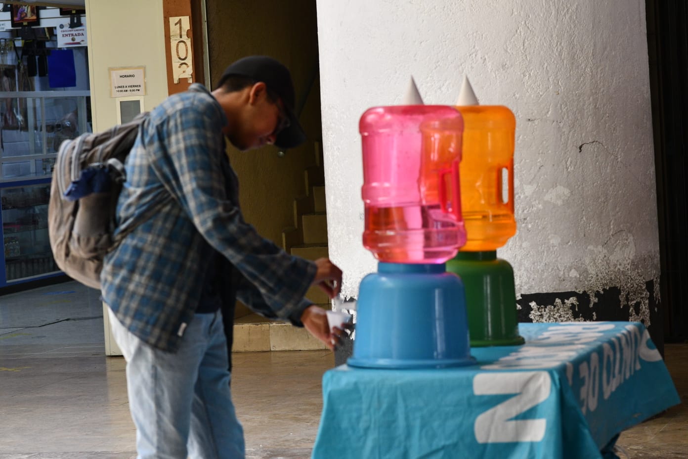En pleno centro de la ciudad dentro del portal, en la llamada ex concha acústica, el Ayuntamiento de Toluca colocó dos garrafones de agua purificada para que quienes se vayan pasando o estén en los comercios aledaños puedan refrescarse ante la incremente ola de calor. Foto E. Varela