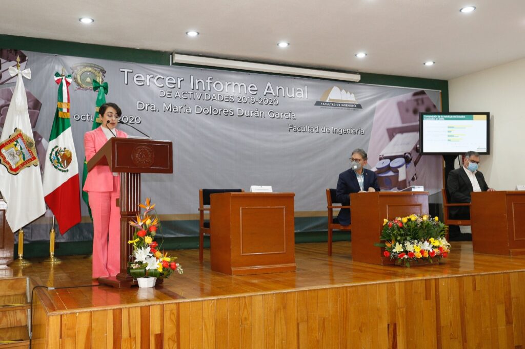 Al encabezar el tercer informe anual de actividades de la directora de la Facultad de Ingeniería de la UAEM, María Dolores Durán García, el rector subrayó el liderazgo académico de la Facultad de Ingeniería, al incorporar a sus programas de licenciatura y posgrado las tendencias globales del conocimiento, así como distinguirse por ser un espacio digno, transparente y vanguardista.