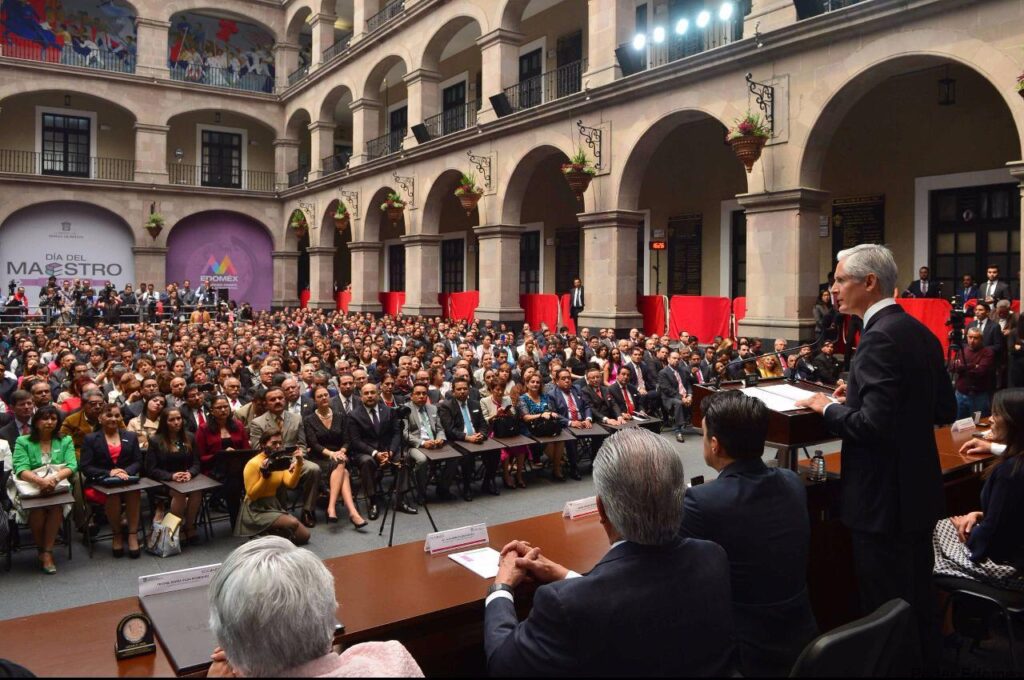 Al encabezar la ceremonia conmemorativa por el Día del Maestro, que se festeja el próximo 15 de mayo, el mandatario estatal otorgó la Presea “Honor Estado de México”, la condecoración “Maestro Altamirano» y el estímulo “Laura Méndez de Cuenca», a profesores mexiquenses de los subsistemas estatal y federalizado, que se reunieron en el patio central de Palacio de Gobierno.