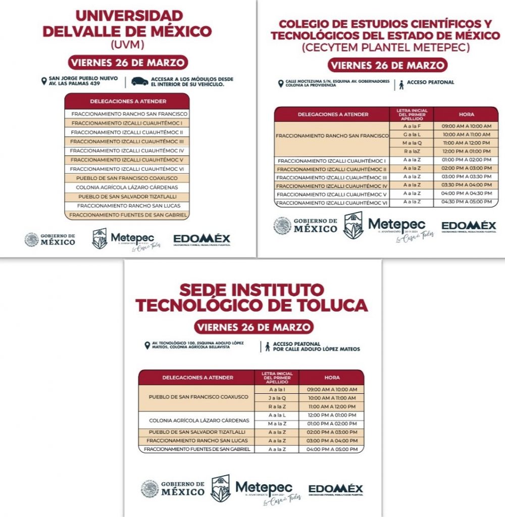 A través de sus redes sociales, al Ayuntamiento de Metepec informó que la Jornada de Vacunación se realizará del 26 al 28 de marzo, y se eligieron como sede los espacios de tres instituciones educativas: el Instituto Tecnológico de Toluca; el Colegio de Estudios Científicos y Tecnológicos del Estado de México (Cecytem) y la Universidad del Valle de México (UVM).