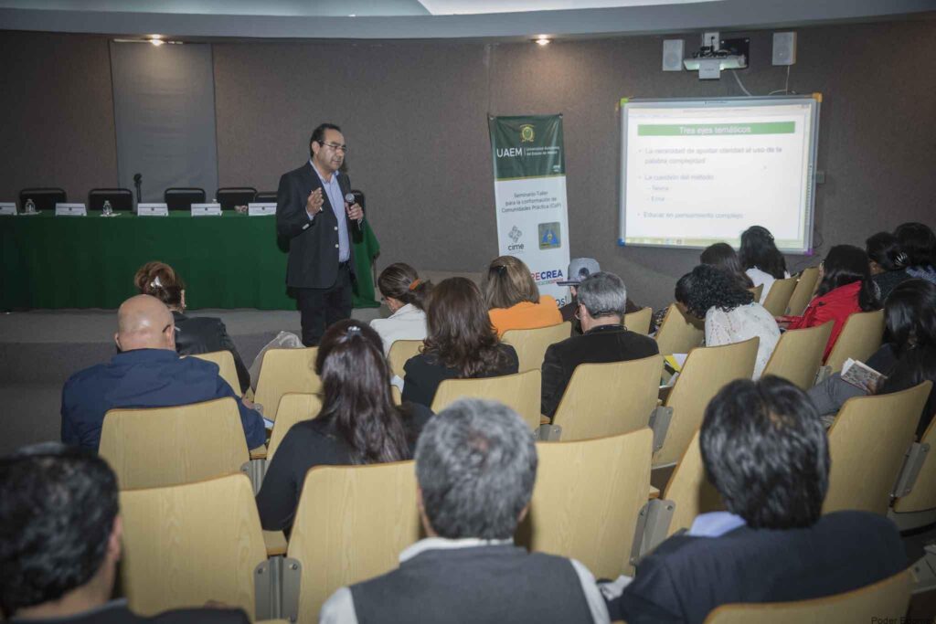 Durante el Seminario-Taller de Conformación de Comunidades de Práctica (CoP), que forma parte de la Red de Comunidades para la Renovación de la Enseñanza-Aprendizaje en Educación Superior (RECREA), explicó que bajo esta lógica, el maestro no tiene el conocimiento absoluto; además, nada es lineal ni está determinado, la verdad no es única y existen azares y errores.