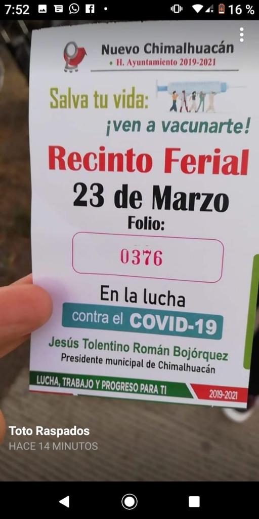 En los boletos entregados se invita a la población de adultos mayores a recibir la vacuna y al final, se aprecia la leyenda “En la lucha contra el Covid19, Jesús Tolentino Román Bojórquez, Presidente Municipal de Chimalhuacán”.