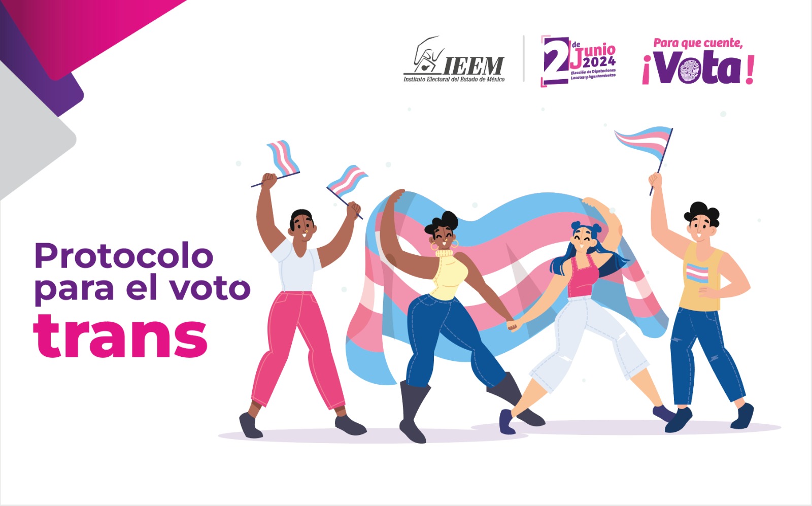 Asumiendo el compromiso con el ejercicio democrático en condiciones de igualdad y sin discriminación, el Instituto Electoral del Estado de México (IEEM), implementa el Protocolo para adoptar las medidas tendientes a garantizar a las personas trans el ejercicio del voto en igualdad de condiciones y sin discriminación en todos los tipos de elección y mecanismos de participación ciudadana para la elección 2024, a través de la Unidad para la Coordinación de los Trabajos de Igualdad de Género y Erradicación de la Violencia Política en Razón de Género (UCTIGEVP).