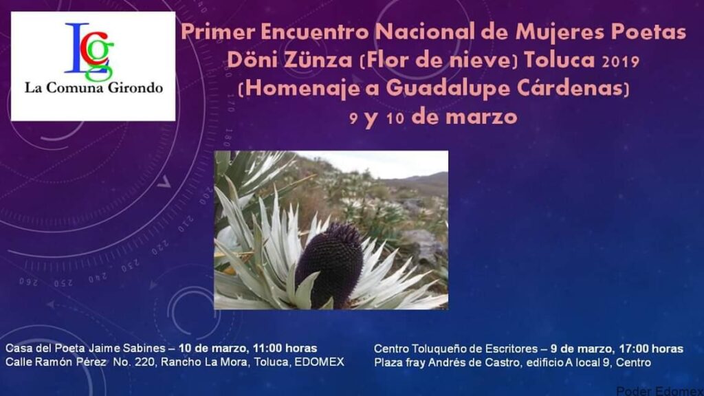Döni Zünza significa Flor de Nieve en Otomí, evocación de la fuerza y la belleza, permanencia y trascendencia, nombre del 1er Encuentro Nacional de Mujeres Poetas Toluca 2019.