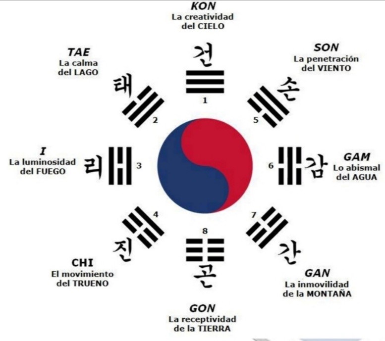 Una barra significa el yang y el yin dos barras, ambos en representación de la creación de la armonización con los principios básicos de todos los fenómenos del cosmos. El Taegeuk, infinito y yin-yang son los tres elementos que constituyen la trinidad filosófica como se menciona en el Samil Sinko, la Escritura de la raza coreana. Según el viejo libro de la historia, Sinsi Bonki, un hijo del emperador de la 5 ª Hwan-ung dinastía, se dijo que había recibido una visión del cielo, se le presentaron visiones de las verdades universales, habiendo observado rituales realizados en el cielo y, por último, recibió los ocho kwaes (barra de signos). Después de todo, esto ha sido transmitido a través de una larga historia por el rey Mun, tsu Chou, Confucio y el académico Kim Il bu, todos descendientes de la raza Tongyi. El académico Kim finalmente concluyó el presente nombre Taegeuk. Fue establecido como la base de la profunda filosofía del Taegeuk para ser entrenado por los principiantes en el arte del Taekwondo. Cada uno de los poomsae ha sido heredado a través de una larga historia de unos 5,000 años, por último, como producto de una técnica científica formulada sobre la base del espíritu nacional tradicional coreano y experiencias prácticas. El poomsae es espíritu que se manifiesta no en un resumen mental de la filosofía expresada en los documentos, sino en las acciones de poomsae.