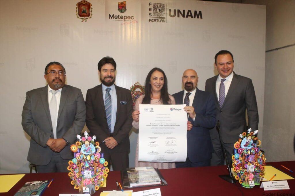 En un emotivo acto celebrado en la Casa de Cultura de la delegación de San Jerónimo Chicahualco, la alcaldesa firmó el convenio con el Director de la FES Acatlán, Manuel Martínez Justo, al que se unió el Comisionado del Instituto de Transparencia, Acceso a la Información Pública y Protección de Datos Personales del Estado de México (INFOEM), Javier Martínez Cruz y con ello, iniciar formalmente los trabajos que ubican a la administración de Metepec a la vanguardia en materia de transparencia.
