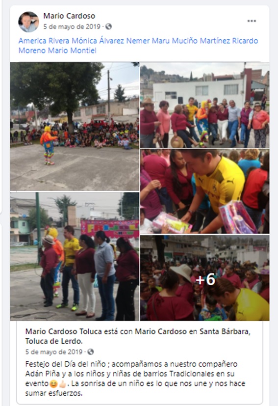En tanto, en publicación del 4 de mayo de 2019 incluye fotos de un evento del Día del Niño en el Estadio de Futbol de San Pablo Autopan, donde refiere, se repartieron regalos con el apoyo de Ricardo Moreno, la diputada local Mónica Álvarez Nemer, y la primera síndico de Toluca, América Rivera Tavizón.
