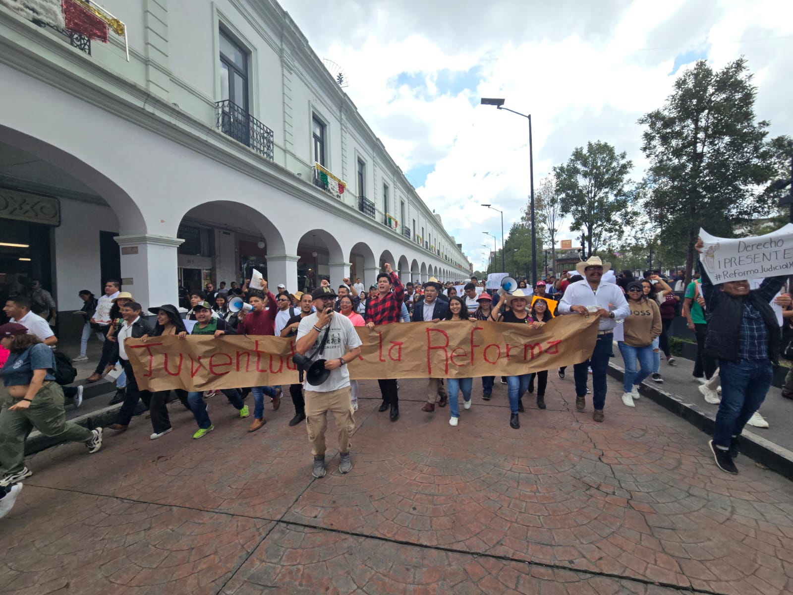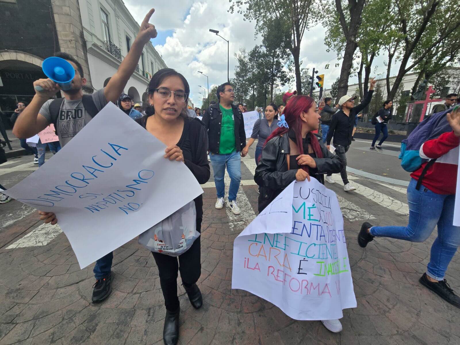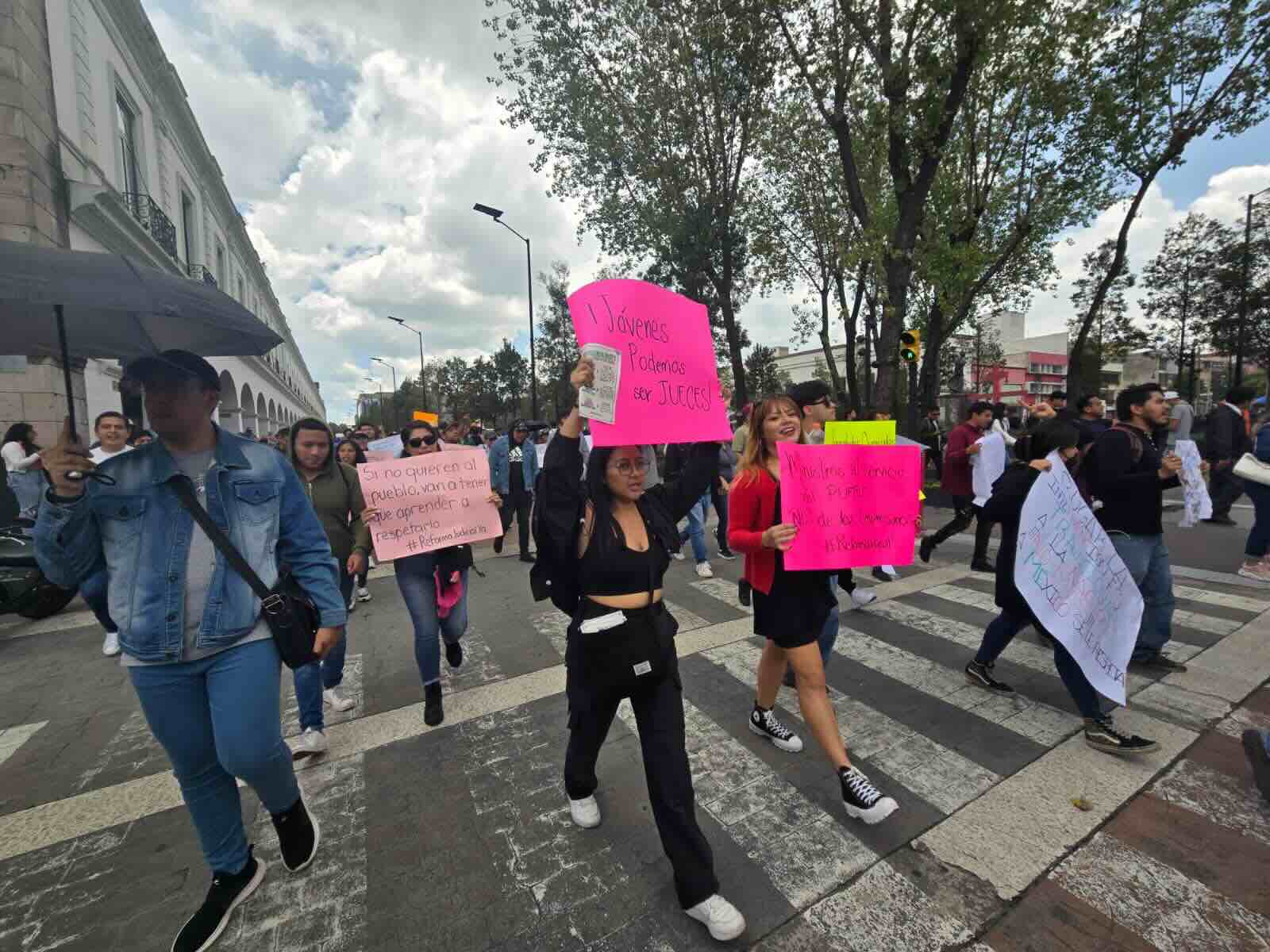 Un grupo de jóvenes portando pancartas marcharon por las principales calles del centro de la ciudad de Toluca en favor de la reforma judicial. Algunos de ellos llevaban cartulinas en donde decían que los jóvenes pueden ser veces y en otras más decían nepotismo no Reforma sí.