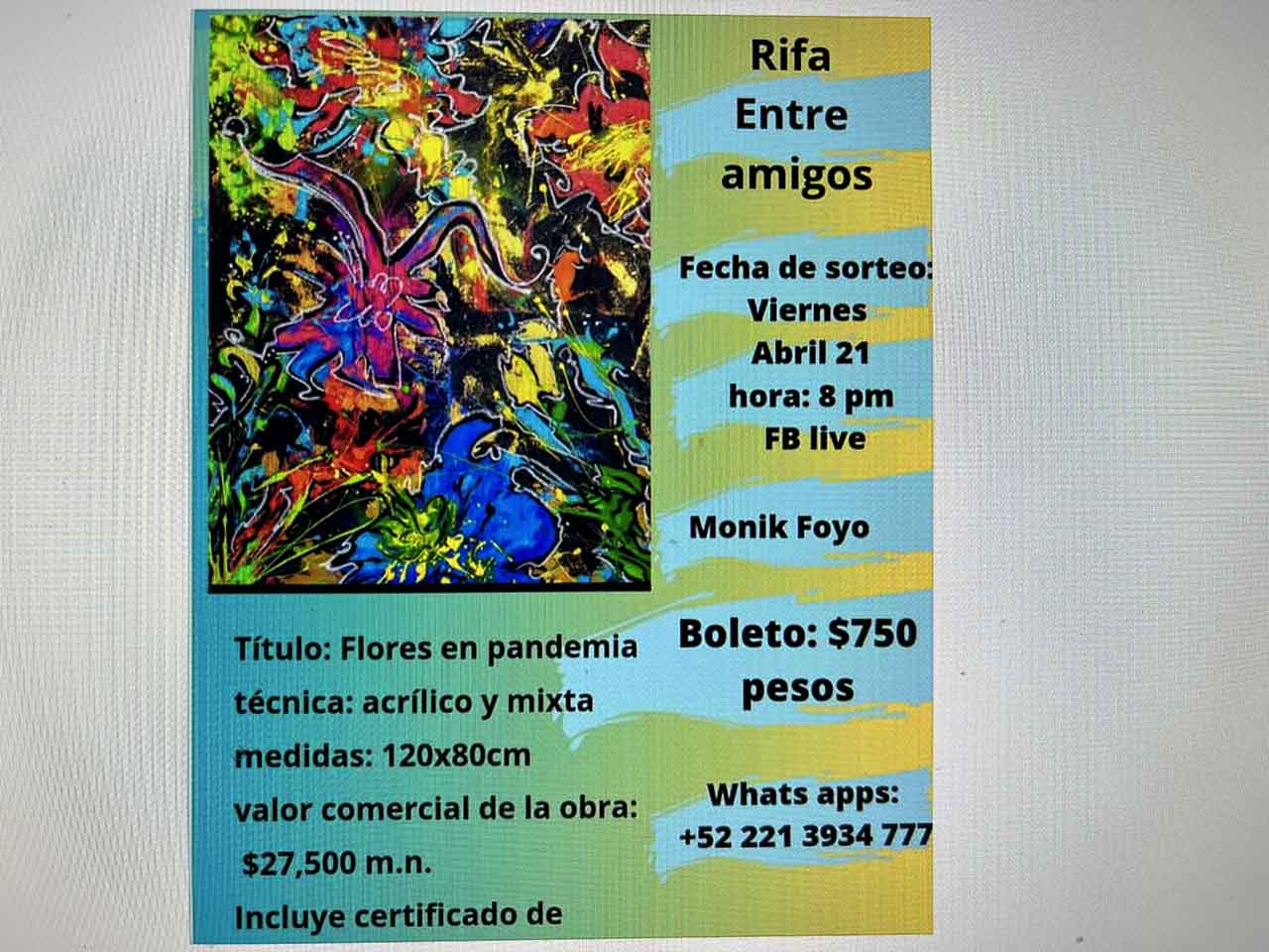 Rifará un cuadro denominado Flores en pandemia, se trata de un acrílico con técnica mixta con medidas 120×80 cm, el valor comercial de la obra es de 27 mil 500 pesos, incluye certificado de autenticidad. El costo del boleto es de 750 pesos.