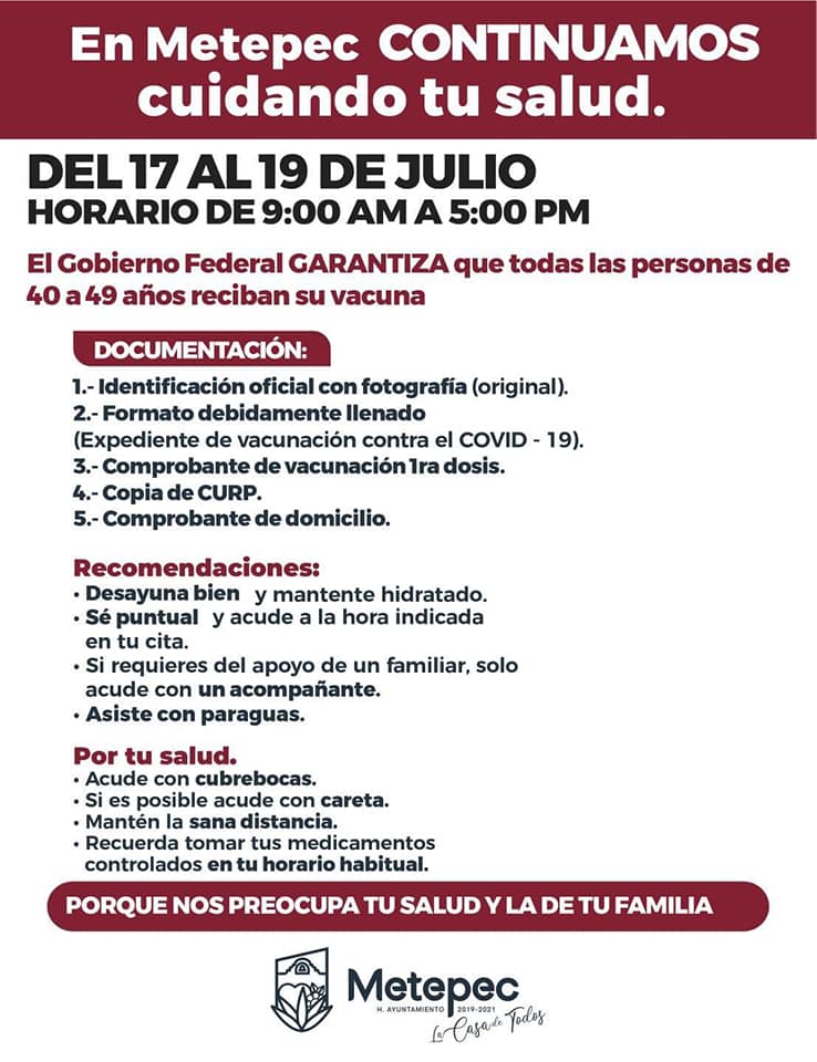 El gobierno de Metepec se encuentra listo para la aplicación de la 2a dosis de la vacuna contra COVID-19, para personas de 40 a 49 años de edad.