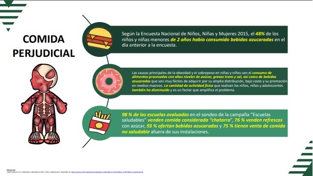 Los datos son contundentes: un sondeo de la campaña «Escuelas Saludables» reveló que el 98 % de las escuelas evaluadas aún venden comida chatarra; el 76 % ofrece refrescos con azúcar; el 93 % ofrece bebidas azucaradas, y el 75 % tiene acceso a comida no saludable fuera de sus instalaciones. “Pero el problema va más allá de las aulas y requiere un cambio de hábitos que empiece en el hogar y se respalde con políticas públicas efectivas que restablezcan los programas de apoyo alimentario en las escuelas”, mencionó Ganem.