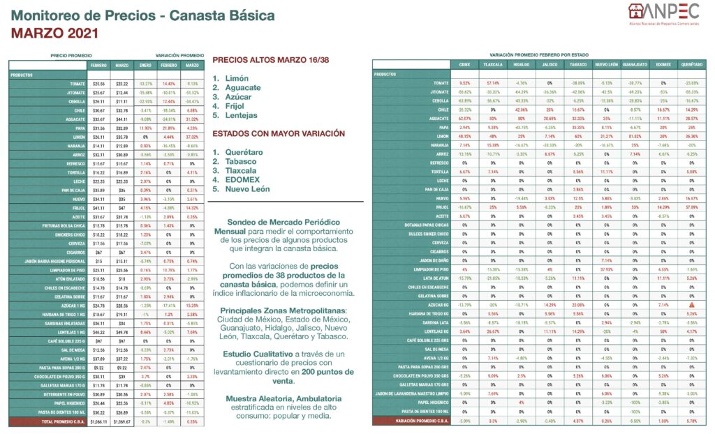 La Alianza Nacional de Pequeños Comerciantes (ANPEC), como cada mes, realizó su sondeo de mercado respecto a los precios de los productos de la canasta básica del 15 de febrero al 15 de marzo en CDMX, Tlaxcala, Jalisco, Nuevo León, Querétaro, Guanajuato, Estado de México y Tabasco, encontrando lo siguiente: