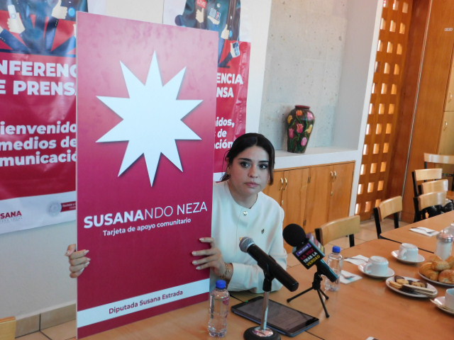 La diputada local Susana Estrada Rojas presentó la tarjeta de apoyo comunitario “Susanando Neza”, que arrancará el próximo 9 de diciembre y que, a través de la donación de su dieta como legisladora, brindará a personas en situación de extrema vulnerabilidad apoyos para gastos funerarios, ayuda alimentaria o apoyo a estudiantes.