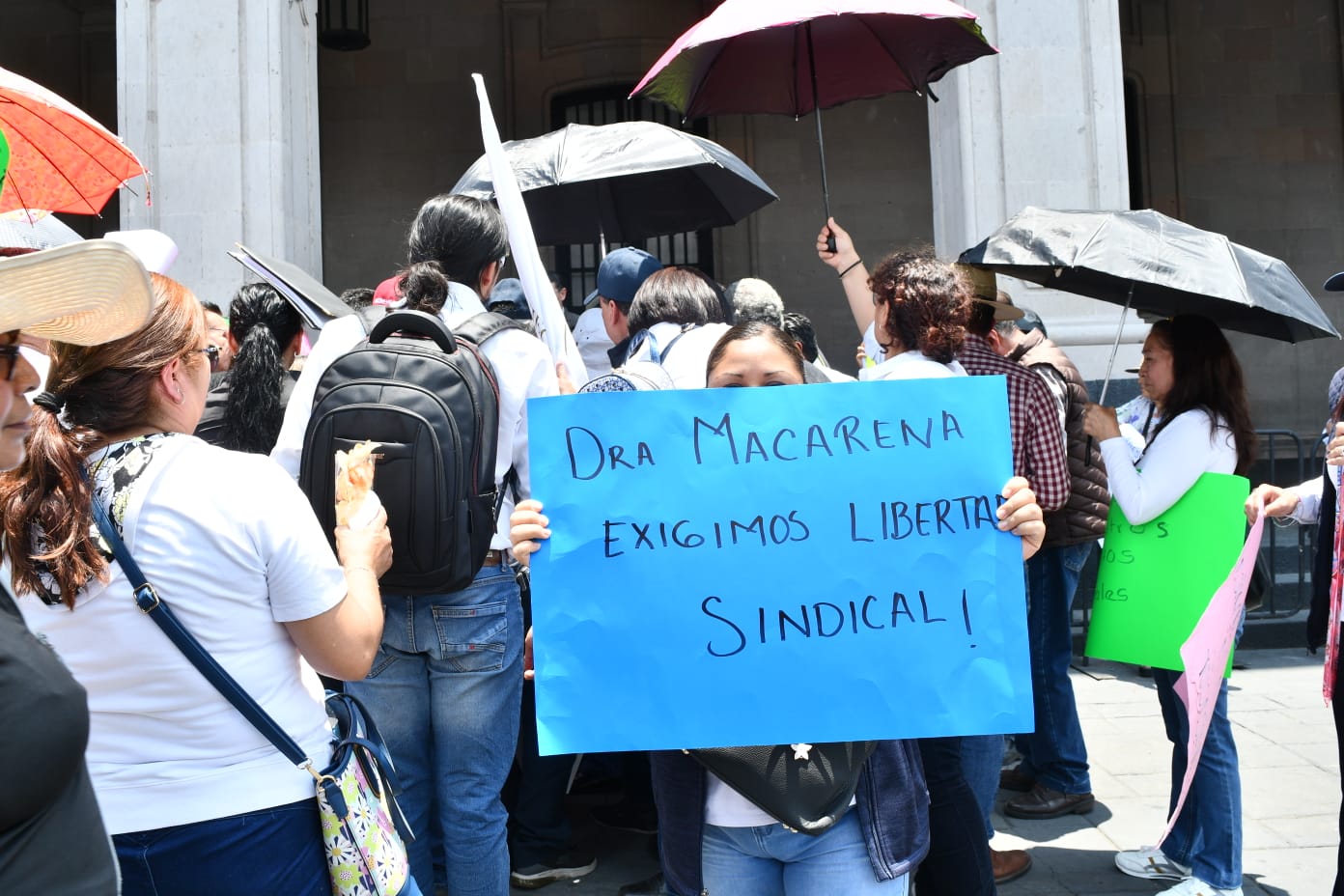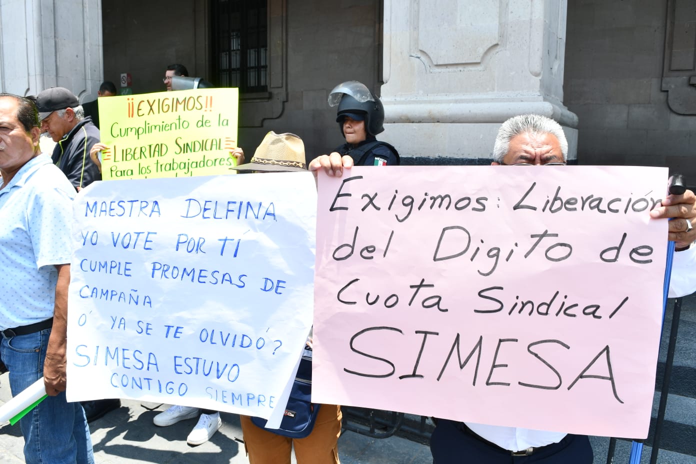 Un grupo de trabajadores del sindicato SIMESA se manifestaron frente a palacio de gobierno en demanda de respeto a sus derechos laborales y para solicitar a la doctora Macarena Montoya Olvera, Secretaria de Salud que haya en libertad sindical.