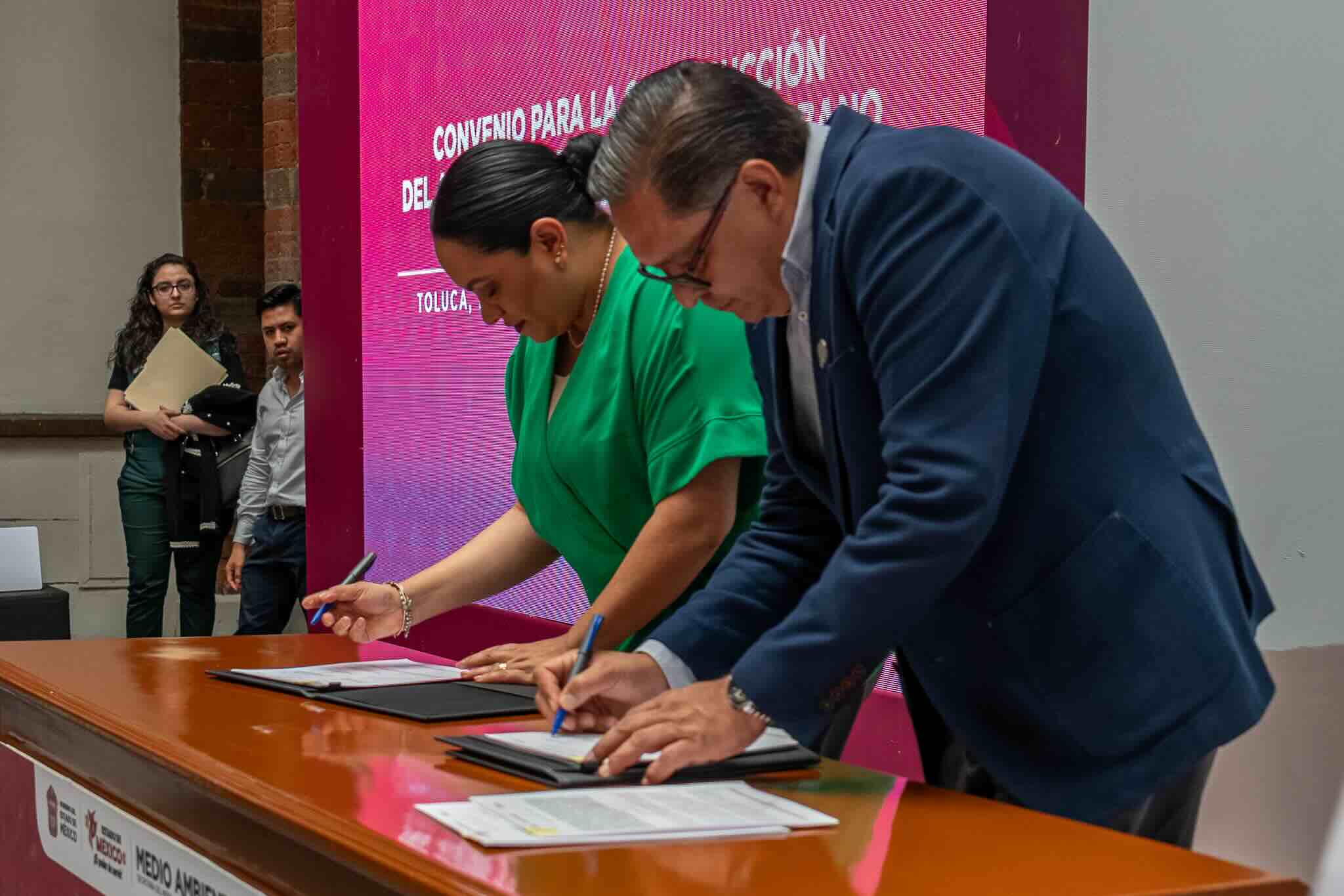 Así, este jueves durante La Toluqueña, el alcalde Ricardo Moreno Bastida firmó el convenio con Alhely Rubio Arronis, titular de la Secretaria del Medio Ambiente del Estado de México, para brindar un acompañamiento técnico para la realización del el Atlas y para el manejo del bosque urbano.