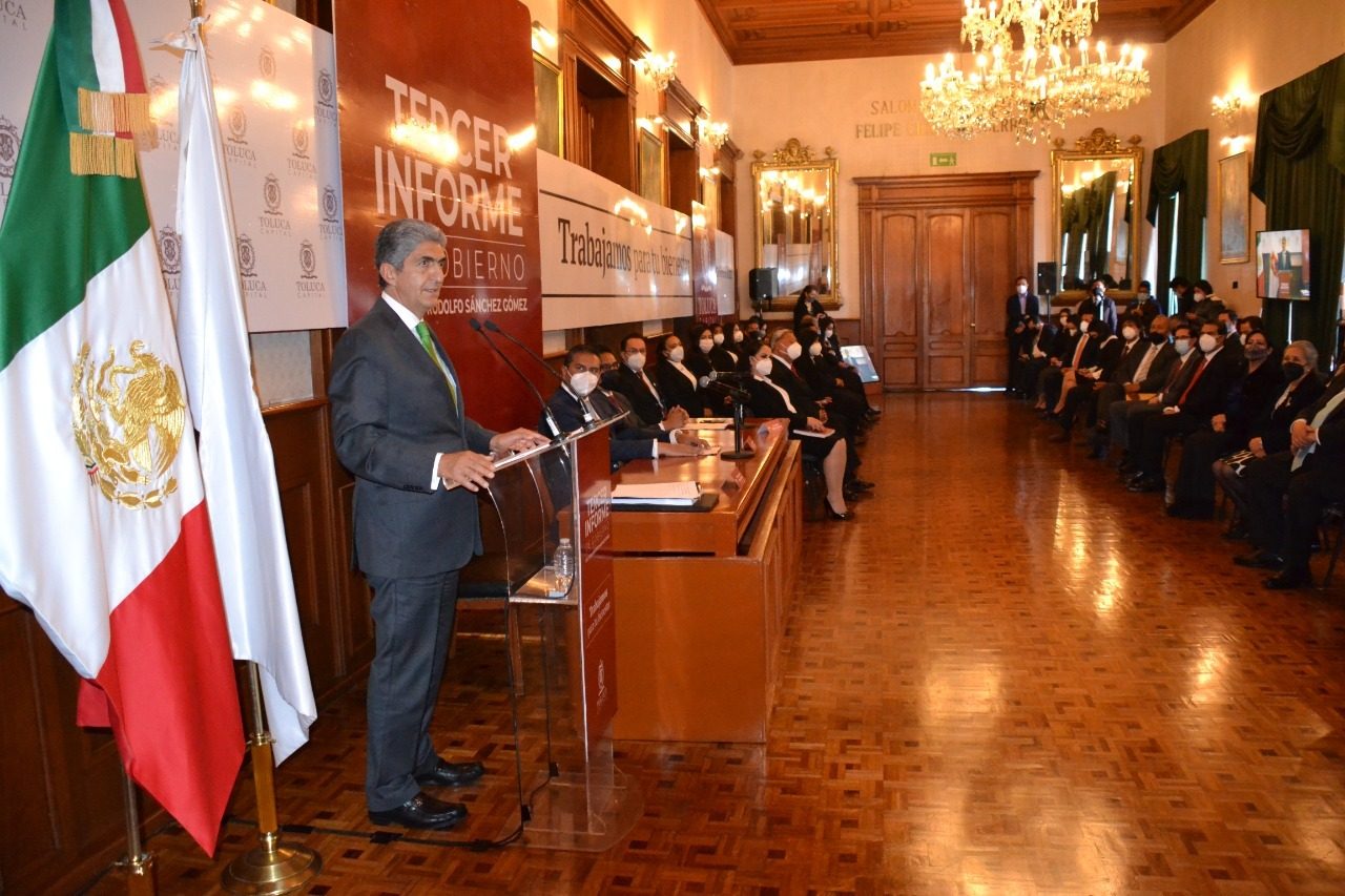 El Gobernador del Estado de México, Alfredo Del Mazo Maza, refrenda su compromiso con los Ayuntamientos, que son la autoridad inmediata, la más cercana a la gente y la que tiene la obligación de responder con eficacia y rapidez a las demandas ciudadanas, señaló el Secretario General de Gobierno, Ernesto Nemer Álvarez, al asistir con la representación del Ejecutivo estatal, al Tercer Informe del Presidente Municipal de Toluca, Juan Rodolfo Sánchez Gómez.