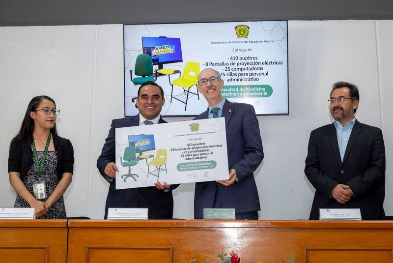Asimismo, Barrera Díaz hizo entrega del reforzamiento estructural del Edificio “B” de la Facultad de Medicina Veterinaria y Zootecnia, el andador del acceso principal y cambio de luminarias del Hospital de Grandes Especies, la reparación de techumbre en bodega de alimentos, 410 pupitres, ocho pantallas de proyección eléctricas, 25 computadoras de última generación y 25 sillas para personal administrativo, así como dos cortasetos, dos desbrozadoras y una máquina de anestesia para el área de tomografía, en beneficio de su comunidad universitaria.