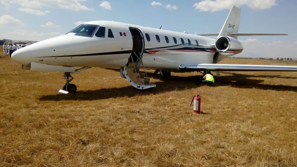Una aeronave tipo Cessna 680 Sovereing, matrícula XA-HIT, se despistó en el Aeropuerto Internacional de Toluca (AIT), sin que se reporten lesionados.