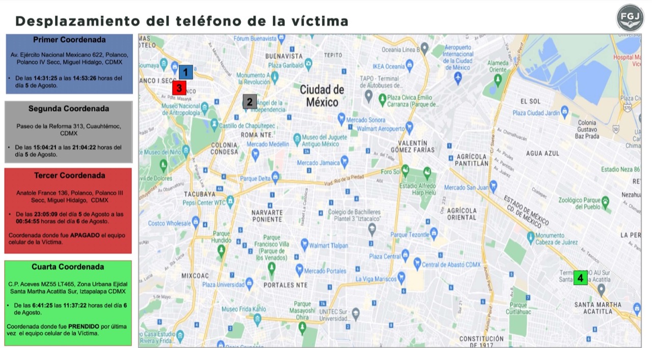 • Análisis técnicos diversos, entre otros, detallados telefónicos y mapeos técnicos de movilidad, los cuales establecen que el equipo telefónico propiedad de la víctima fue apagado a las 00:05:09 horas del domingo 6 de agosto en la alcaldía Miguel Hidalgo en la CDMX y fue encendido a las 06:41:25 horas del mismo día en el área de Santa Martha Acatitla en la misma entidad, fecha y lugar en la que registra su última actividad, la cual se identifica a las 11:37:22 horas. Agentes de la Policía de Investigación continúan con el análisis de los detallados, tanto de la línea como del dispositivo móvil para establecer su ubicación actual.