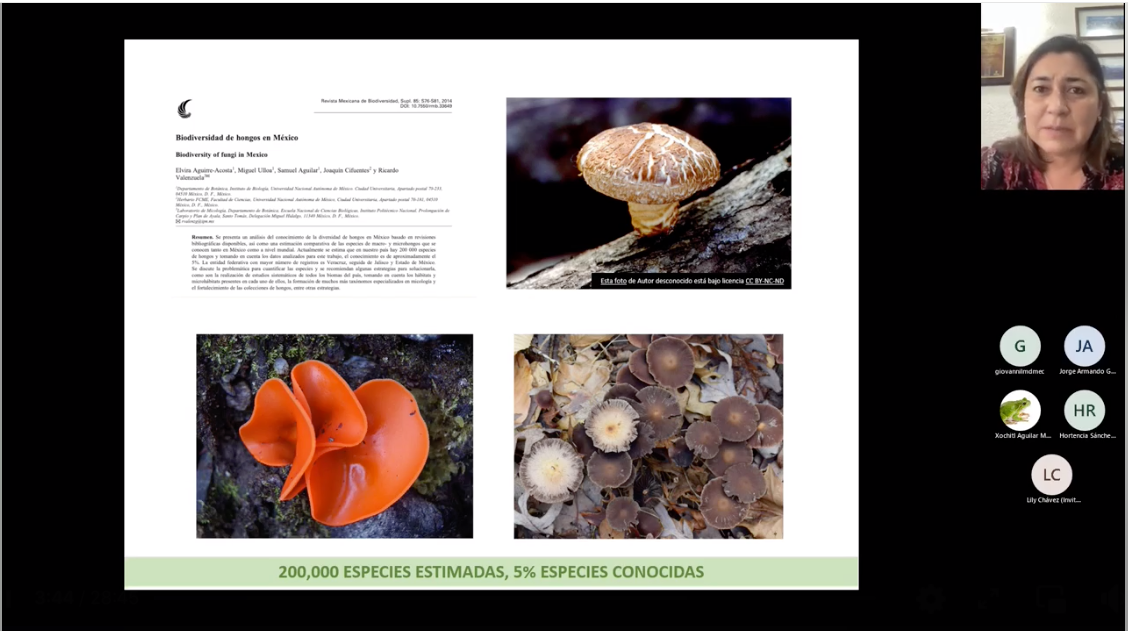 Cristina Burrola Aguilar concluyó su participación enfatizando que “sin hongos no hay bosque y sin bosque no hay hongos. Su asociación es un continuo y complejo mutualismo que los especialistas llamamos el internet en las plantas y los hongos”. Invitó a adentrarse en la investigación micológica, ya que -dijo- a nivel mundial existen cerca de un millón de especies de hongos y solo se conoce 7% de ellas, mientras que en nuestro país hay alrededor de 200 mil especies y solo se tiene conocimiento de 5% de los mismos, por lo que conocerlos ayudará al mantenimiento de los ecosistemas e incluso, puede evitar el cambio climático.