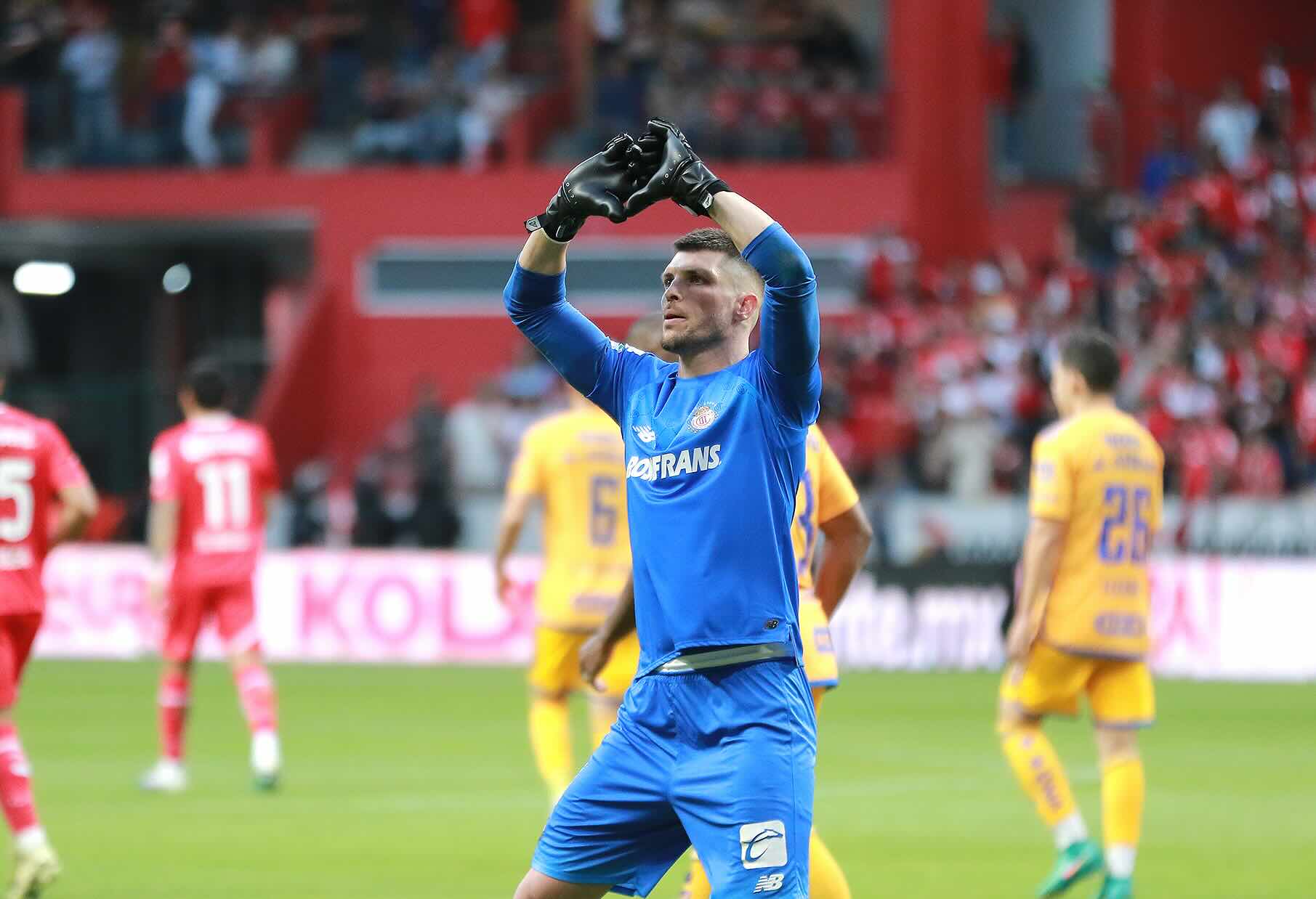 EL PORTERO tigre se ganó la amonestación al insistir en que era fuera de juego, pero como no fue así, el árbitro Escobedo le recetó tarjeta amarilla.