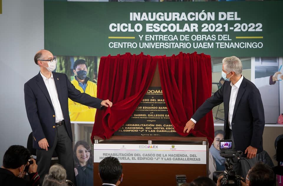 Con una inversión de 45.4 millones de pesos, Del Mazo Maza y Barrera Díaz entregaron obras, rehabilitación y mantenimiento en el Centro Universitario UAEM Tenancingo para la restauración del casco de la hacienda, así como al edificio J, las caballerizas y el Hotel Escuela, que sufrieron daños tras los sismos de septiembre de 2017.