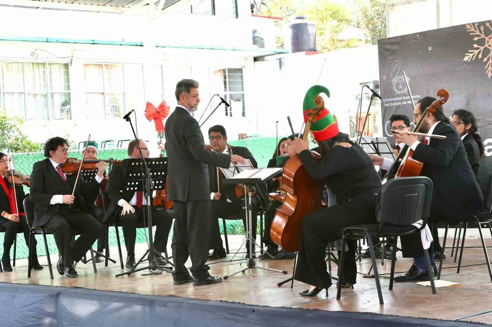 Almoloya de Alquisiras, Méx. – La rectora de la Universidad Autónoma del Estado de México (UAEMéx), Martha Patricia Zarza Delgado, encabezó el primer concierto de navidad de la institución, a cargo de la Orquesta de Cámara, que se llevó a cabo en el Plantel “Mtro. José Ignacio Pichardo Pagaza” de la Escuela Preparatoria y que tiene como propósito fortalecer la identidad universitaria y acercar la cultura a espacios académicos y la sociedad en general.
