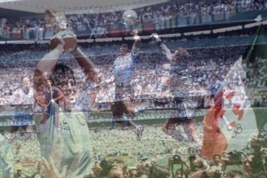 En 1984 es transferido al Napoli, donde dejaría una marca imborrable en el club, jugando hasta 1992. El Napoli, equipo del sur de Italia, a pesar de su numerosa hinchada, se veía rezagada por el poder económico y político de los clubes del norte. En la temporada que precede a su llegada al equipo había evitado el descenso a segunda división por un punto, lo que marca claramente su situación. En 1986 se marca tal vez el hito más grande de su carrera deportiva, al ganar la copa del mundo con su selección, siendo la gran figura del equipo. En ese mundial, sin dudas el partido contra Inglaterra en cuartos de final marcaria su carrera y su vida. Es vital señalar la fuerza simbólica de este partido para la nación Argentina. En 1982, argentinos e ingleses se enfrentan militarmente en la guerra de las Malvinas, que apenas en dos meses redundaría en la derrota estrepitosa de Argentina ante el poderoso ejército inglés. El partido del mundial aparecía así como una revancha simbólica ante aquella derrota. El partido terminó 2 a 1, con dos goles de Maradona: el primero con la mano, lo que el mismo catalogaría como la mano de Dios, y el segundo, considerado como el mejor gol de la historia, denominado como el gol del siglo. En Yo Soy el Diego nos cuenta: Para mí, el Mundial de México ’86, la más grande alegría deportiva de toda mi carrera, había empezado, en realidad, tres años antes. Bah, también podría decir que comenzó en el mismo momento en que terminó el Mundial de España, porque la revancha me daba vueltas por la cabeza desde aquellos terribles días.